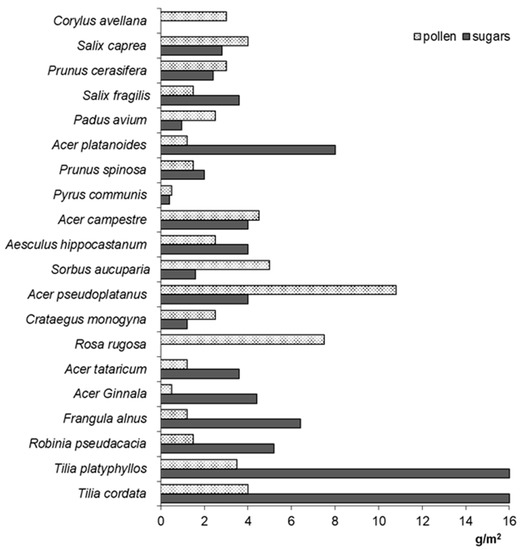At the species level, the total amount of food resources available is related to the nectar/pollen amount per floral unit (=flower/inflorescence) and abundance of flowering (=number of developed flowers) of an individual tree/shrub [63]. Woody plant species are known to flower abundantly; however, they show considerable year-to-year differences related to alternating flowering [63,64,75,77,78,84]. For instance, Tilia cordata can develop from 121,000 to 1,473,000 flowers per tree [85]. Accordingly, one Tilia tree can produce 0.3–2.0 kg of sugars [78]. Data on the nectar sugar productivity of particular tree species are presented in Figure 1.