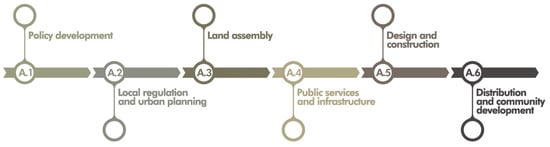 This paper aims to widen the scope of the investigation and to offer a broader picture by building on research on housing affordability conducted by the World Economic Forum, which recommends adopting a value chain approach [77]. This approach requires mapping the challenges to affordable housing onto the supply side of the affordable housing value chain, which can be broken down into six value-adding activities (see Figure 1). The process of delivering affordable housing starts with the development of national housing policy settings, in which central governments define the required levels of affordable housing provision, as well as the supporting schemes and programmes which are expected to help the country deliver on the expected targets [78,79]. The national policy guides the network of stakeholders operating in the affordable housing value chain, and its directions inform the urban planning systems which local public authorities shape to coordinate affordable housing practice in cities and regions [80]. In accordance with national and local land use regulations, local public authorities are also required to collaborate with private sector actors in order to assemble and allocate suitable land for affordable housing developments [81,82,83]. After completing the land assembly process, utility companies and public service providers create the public infrastructure assets for community development which are essential in increasing affordable housing provision. Examples of public infrastructure assets include utility services, transport infrastructure, schools, and open spaces, as well as community, health, and leisure services [84,85]. Housing developers, together with their subcontractors, are then called to organize and execute the design and construction phase of affordable dwellings, which are allocated, managed, and maintained by independent, not-for-profit organizations which provide homes for people in housing need. These organizations generally belong to the housing association sector [86,87].
