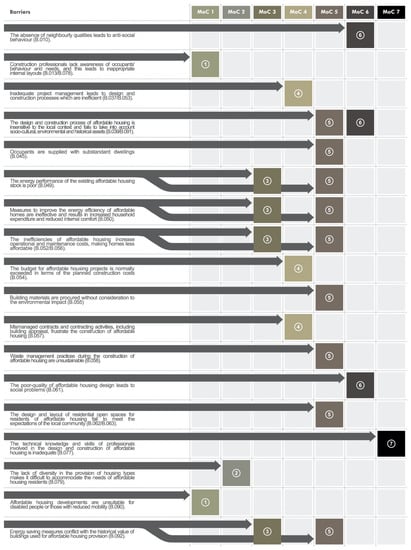 After completing the hierarchical clustering procedure, the groups of keywords belonging to each cluster were analyzed together with their contextual data, placing them in the larger picture. WordStat’s Keyword-In-Context feature was applied to assist the examination. This activity was instrumental in observing the keywords within the coded segments and capturing the broader understanding needed to uncover the barriers affecting affordable housing supply which their interrelation reports on. During this exploratory process, each barrier was assigned a code and expressed in the form of a challenge statement to provide a general description of its significance within the affordable housing provision system. The statements were then analyzed to detect and merge duplicate barriers resulting from two or more clusters reporting on the same issue but by using different sets of keywords. Finally, all the barriers were assigned to the section or sections of the value chain in which they were generated.