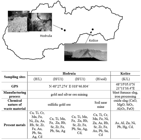 The main difference between the Košice and Hodruša localities is the chemical composition of the ore and the different levels of the processing process. The Košice landfill is constantly refilled with ore waste, in comparison to Hodruša, where ore arrives from the mine and at the landfill before industrial processing. At the Hodruša sampling site, the landfill is composed of sulfidic ore that was extracted directly from the mine before processing.