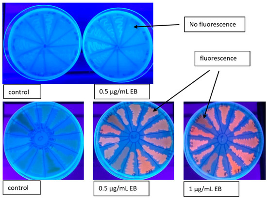 The ethidium bromide-agar method used in our experiment to determine the overexpression of the bacterial efflux system is also used for detecting phenotypes responsible for multidrug resistance recognition. This method is based on the existence of a maximum concentration of ethidium bromide, which is effectively extruded by the cell’s efflux system, with the assumption that higher concentrations of ethidium bromide will be captured in the cells of susceptible bacteria. Subsequently, when this bacterial mass is exposed to UV light, fluorescence will be detected [22,23].