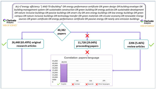 The present study on the energy efficiency of buildings involves bibliometric and visualization analysis in combination with specialized software applications that provide a quantitative measurement of articles and reports completed to date, bridging chronological gaps, and delivering a useful resource for academics interested in this area. Moreover, 28,555 papers were returned by the complex algorithm used in searching and sorting data over a long period of time and constituted the resource for bibliometric analysis. Most of the analyzed papers (91.76% or 26,203) were published in the second period analyzed (2011–2023), indicating that this topic has gained high interest in this latter period due to the advantages arising from technological advancement.