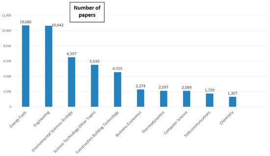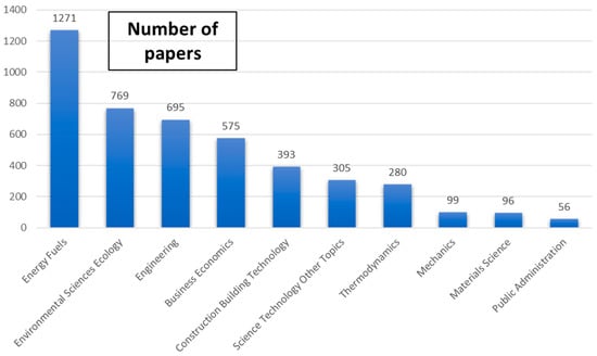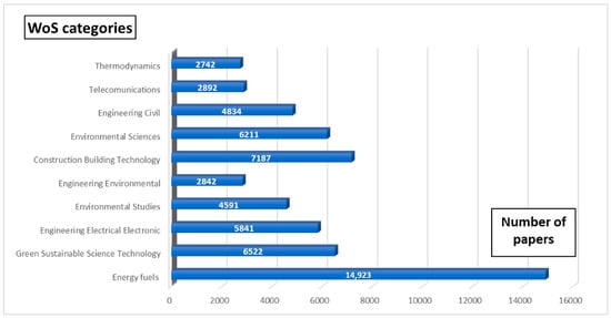 The papers were classified by WoS into 74 categories. Figure 5 shows the categories in which most of the papers were classified. The category with the most articles (1271) was “Energy Fuels”, followed by the category “Environmental Sciences Ecology” with 769 articles.