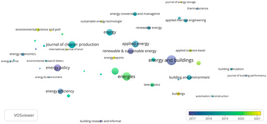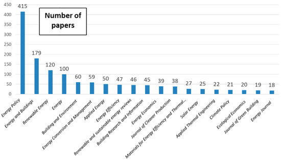 During this period, 557 journals were identified that published at least one paper in the evaluated field. Of these journals, 29 (5.20%) had at least 10 papers published. The most prolific journal was Energy Policy with 415 (17.64% of the total) papers published. This journal has an impact factor (IF) of 7576, or 7014 without self-citations, and on average, each paper had 60.59 citations, indicating that papers published in this journal have had a significant impact in this field. The second journal in terms of number of papers published was Energy and Buildings. This journal published 179 (7.61%) papers (a significant difference from Energy Policy with 415 papers published) and has an IF of 7201 or 6147 if self-citations are excluded. Table 2 details the most prolific journals in this period, and Figure 4 shows the journals with at least 10 papers published.