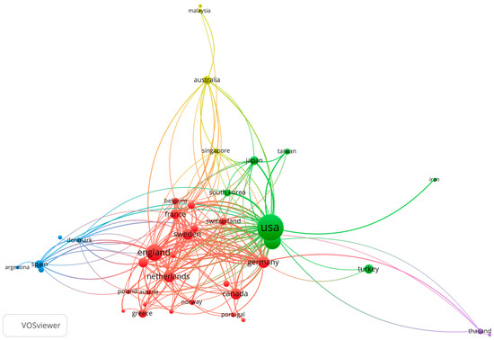 Figure 6 shows a map of co-authorship by country. In this figure, the countries that have at least 10 published papers (41 or 45.55%) are represented. These countries are grouped into five clusters: the red cluster contains 22 countries and is led by England (by number of articles); the green cluster includes 7 countries and is led by the United States; the blue cluster contains 5 countries and is led by Spain; the yellow cluster contains 4 countries and is led by Australia; and the purple cluster contains 2 countries and is led by Thailand. The countries that have collaborated most often are the United States and China, the United States and England, and the United States and Germany.