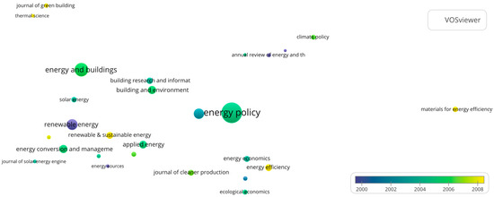Figure 7 shows the average publication years of the 29 journals that had at least 10 papers published. Energy Policy, the most prolific journal of this period with 415 papers published, had an average publication year of 2004.79. The average publication year of Energy and Buildings, the second most prolific journal, was 2005.72. Renewable Energy had an average publication year of 1999.11 and Energy, 2002.50. The journals that published the most articles towards the end of the period analyzed were Renewable and Sustainable Energy Reviews (2007.95), Journal of Green Building (2008.71), and Energy Efficiency (2008.87).