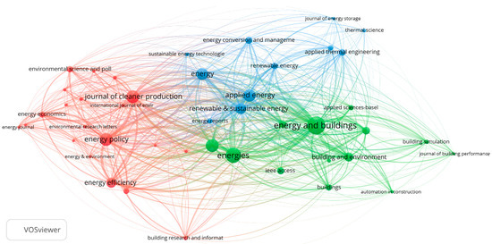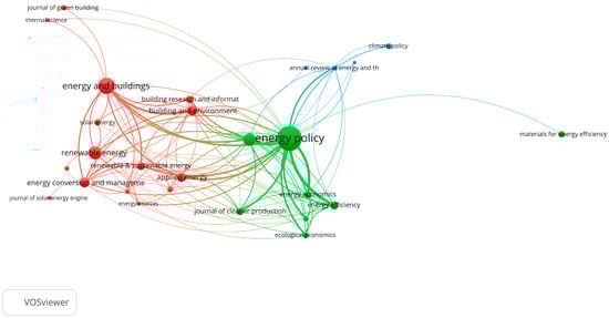 The parameters used for filtering the included journals were also used in the analysis shown in Figure 8, which depicts the citation network map between journals. According to Figure 8, the journals are grouped into three clusters. The red cluster contains 15 journals and is led by Energy and Buildings; the green cluster contains 8 journals and is led by Energy Policy; and the blue cluster contains 4 journals and is led by Climate Policy. The journals most strongly connected by frequently cited papers are Energy Policy and Energy, Energy Policy and Energy Economics, Energy Policy and Energy Efficiency, Energy and Buildings and Building and Environment, and Energy and Buildings and Energy Policy.