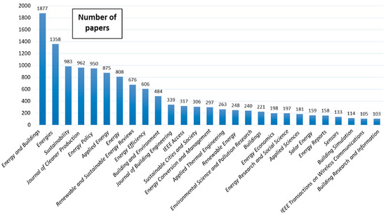 A total of 2888 journals were identified as having published papers in this domain, which is a significant increase from the first period (557), indicating that interest in this area has increased considerably. The number of journals that had at least 50 papers published was 60 (2.07%). The most prolific journal was Energy and Buildings with 1877 papers published (7.17% of the total output in this period). This journal has an IF of 7.201 and an IF score without self-citations of 6.147, with an average of 30.77 citations/paper. The second journal in terms of number of articles published, Energies (1358, 5.19%), has an IF of 3.252 and an IF without self-citations of 2.466. Table 6 details the top 10 journals ranked by number of papers published, and Figure 11 shows journals with at least 100 papers published.