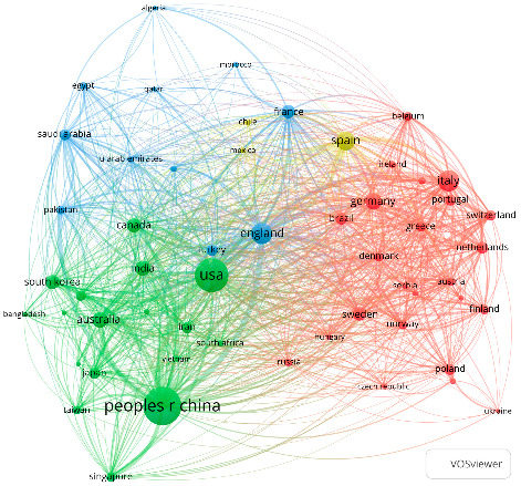 On the network map of the co-authorship by country, the color indicates the cluster in which the respective country is located. Countries that have stronger collaborative links are represented closer together on the map. The size of the node/bubble is directly proportional to the number of articles published, and the thickness of a line connecting two bubbles/nodes is directly proportional to the degree of collaboration between the countries.