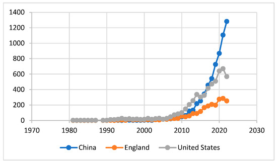 Overall, China has published the most papers in this field (6349), followed by the United States with 5310 published papers and England with 2179 published papers. In total, these countries published 13,838 (48.46%) of the total number of papers, indicating that sustainability is a topic of primary interest in these countries. Figure 18 shows in detail the evolution over time of the number of papers published by these countries. The number of articles published by these countries has gradually increased, and since 2010, a much faster increase can be observed in correlation with technological development. The first year in which China surpasses the United States in the number of articles published (343 vs. 325) is 2016.