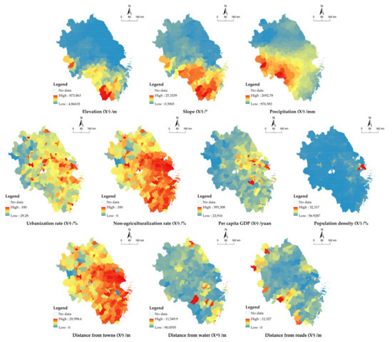 This study selected ten driving factors (Figure 3) from the three aspects of natural environmental conditions, socioeconomic conditions, and location conditions to investigate the impact of each index on the spatial distribution characteristics of rural settlements at the county level. The selection of these factors was based on existing research [38,45,46] and the principle of data availability while considering the actual situation of the Yangtze River Delta region. Among them, elevation, slope, and precipitation are natural environment factors; urbanization rate, non-agriculturalization rate, per capita GDP, and population density are social and economic condition factors; and distance from the road, distance from town, and distance from water area are location condition factors. It should be noted that the no-data areas are a county unit that has undergone major administrative regional adjustments in 2020. Therefore, they are eliminated in the data statistics stage to avoid the research errors caused by this situation.