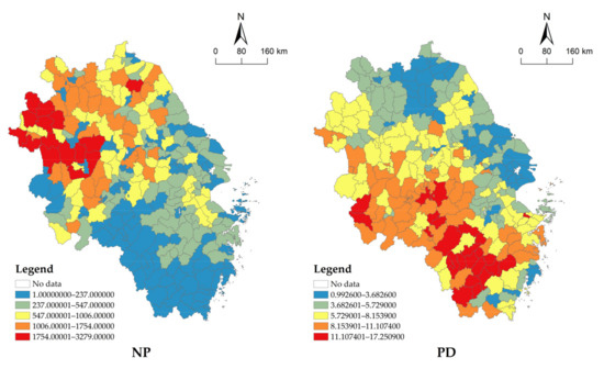 Spatial distribution of rural settlements NP and PD in the Yangtze River Delta region.