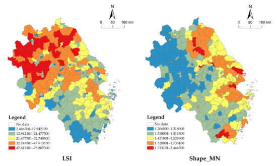 Spatial distribution of rural settlements LSI and SHAPE_MN in the Yangtze River Delta region.