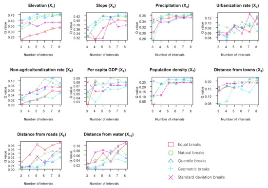 In the process of using geographic detectors, different spatial data dispersion methods and different interval number combinations have a significant impact on the q value. Figure A1 and Figure A2 show the q values of each factor in different classification methods and the number of partitions when detecting the spatial distribution of CA and LSI in rural settlements. The classification and zoning method with the largest q value is used as the optimal parameter of the geographic detector in this study.