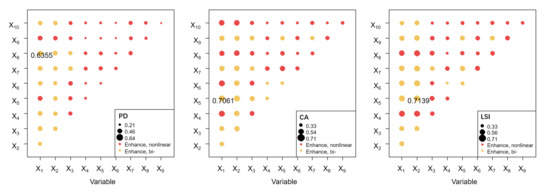 The interaction detector utilizes the q(Xi ∩ Xj) value obtained from the detection results to determine whether two factors are independent of each other or increase/decrease the explanatory power of the dependent variable in explaining variance (Table 2).
