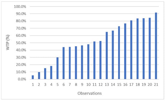 Information about WTP more to stay at a green hotel or to support green practices in the hospitality sector exists in 15 out of 22 surveys (this information is not relevant for the three RP surveys and is not provided in four SP surveys). The percentage of survey participants who are willing to pay more ranges between 5.4% and 91.6%, depending on the SP method used, the investigated country, the data collection method, and the valuation scenario. In total, there exist 21 observations (Figure 4), with a mean value equal to 53.2% (s.d. = 26.5%) and a median equal to 51.9%.