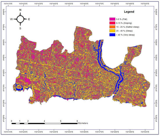 Based on the slope of the land, Girisubo District is divided into three groups: steep, moderate, and sloping. Areas classified as steep have a land slope greater than 25° and are classified as moderate with a land slope of 15–20°. In contrast, areas classified as sloping have a slope of less than 15°. The Figure 4 shows the slope of the land in Girisubo.