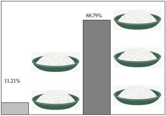 Household income plays a crucial role in determining the accessibility of food within a household, thereby influencing consumption patterns and nutritional outcomes. The size of a household directly influences the distribution of income, which in turn impacts the allocation of resources towards food consumption, non-food consumption, and potential savings. Distinctions can be observed in the food consumption patterns between households with upper and lower-middle incomes. Lower-middle income households tend to prioritize consumption of inexpensive calorie sources, often relying predominantly on staple foods, which can have repercussions on their overall nutritional intake. Consequently, unmet food requirements across various food groups can adversely affect health outcomes [40]. Regarding the dietary habits observed in the study area, the majority of households (88.79%) follow a three-meal-a-day pattern, with rice serving as the staple food. The remaining 11.21% of households consume two meals per day. Figure 7 provides a visual representation of the frequency of daily meals among the surveyed households.