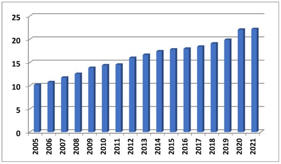Dynamics of renewable energy levels in the EU in 2005–2021. Source: compiled by authors based on EURstat data.