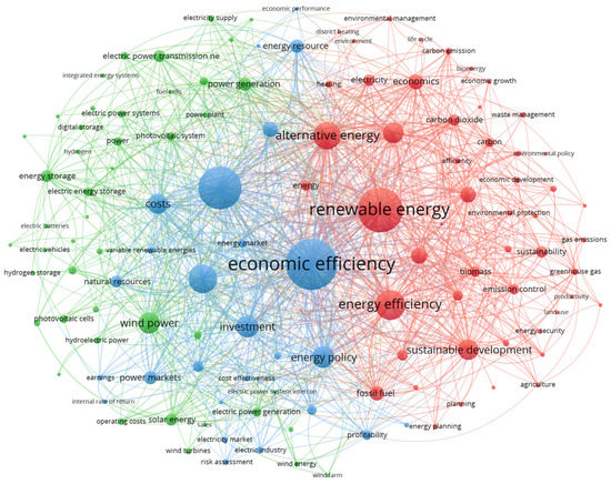 The third cluster (blue) contains 26 items with the main keyword “economic efficiency”, focusing on the economic efficiency of renewable energy resources, energy policy, investment, power markets, and commerce.
