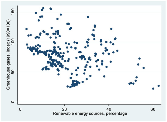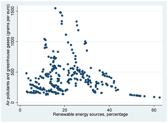 GDP per capita appeared to be an insignificant factor for the first and third models, while it proved to be statistically significant for the model on air pollutants and greenhouse gases (grams per EUR) when an increase in GDP per capita of 1000 USD is associated with a reduction in greenhouse gases of 7.1 g per EUR. It is worth noting that an increase in energy use (kg of oil equivalent per capita) in households leads to an increase in CO2 emissions (tons per capita) throughout the whole of society. EU-27 economies are still industrial societies, and an increase in industry share (% of GDP) by one percent leads to a 100 kg increase in CO2 emissions per capita. The relationships between renewable energy sources and environmental efficiency can be also seen in the following figures (Figure 4 and Figure 5).
