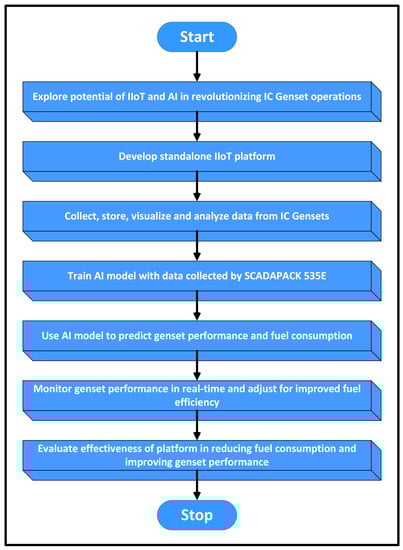 Figure 1 shows an outline of the methodology employed in this research paper. The aim of this study was to investigate the effectiveness of an AI–IIoT-based engine-monitoring and control system in reducing fuel consumption and enhancing predictive maintenance in a Caterpillar diesel engine.