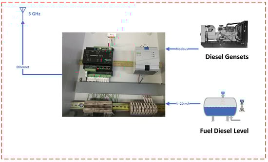 The engine control module (ECM) is a central component of the genset’s control system. It is responsible for monitoring parameters such as engine speed, temperature, and fuel consumption and adjusting its performance to ensure optimal operation. The ECM is connected to a wide range of sensors and actuators that provide data and allow it to control various aspects of the genset’s operation. In our study, the genset’s ECM played a crucial role in providing real-time data on the genset’s performance, which were used for fuel savings and predictive maintenance analysis. The ECM was connected to a SCADAPACK 535E programmable controller, which was used to gather data from the genset’s ECM and other sensors, such as the radar-level transmitter. The data collected by the SCADAPACK 535E were then sent to a cloud-based platform for further analysis using AI and IIoT.
