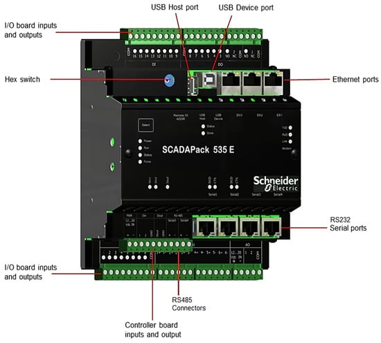 Prior to the implementation of our automated data collection and analysis platform, the genset’s performance was reliant on manual controls and sporadic maintenance, leading to suboptimal operation and excessive fuel consumption. However, with the integration of this cutting-edge technology, the genset’s performance was optimized, resulting in significant fuel savings and a remarkable improvement over the previous manual approach. Moreover, our low-cost solution demonstrated the potential for broader applications of IIoT and AI in industrial settings, particularly in the optimization of heavy-duty power generation equipment such as gensets. Despite the extensive exploration of these technologies, their potential to revolutionize the performance of gensets and similar equipment remains largely unexplored, and our study provides a valuable contribution to this area of research. Data collection for our research was conducted using various industrial automation tools and devices. One of the key components used in this process was the SCADAPACK 535E shown in Figure 3, a programmable logic controller (PLC) that was used to interface with the genset’s engine control module (ECM) and collect data on the genset’s performance. The SCADAPACK 535E was also used to interface with a radar-level transmitter, which was used to measure the fuel level in the genset’s fuel tank. We used the Modbus RTU protocol as a communication protocol to interface between the SCADAPACK 535E and the other devices. This allowed us to easily collect and transmit data from the genset’s ECM and the radar-level transmitter to our data collection and analysis software.