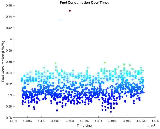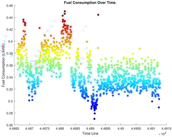 The fuel consumption rate (L/kWh) was analyzed to provide a fair comparison of the diesel genset’s performance before and after implementing the AI–IIoT system. Throughout this section, several figures employ a color gradient from blue to red to represent varying levels of fuel consumption rate, measured in liters per kWh. Specifically, data points with lower fuel consumption rates are represented in blue, while data points with higher fuel consumption rates are depicted in red. Intermediate values are represented by colors transitioning between these two extremes. This consistent color-coding provides a visual representation of the range and distribution of fuel consumption rates observed during our study, allowing for an immediate and intuitive understanding of the data presented.