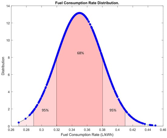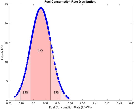 Figure 7 displays a 2D scatter of the fuel consumption rate over 1000 h before implementing the proposed system. The data show that fuel consumption varied widely over this period, with no clear trend or pattern. However, Figure 8 presents the distribution of fuel consumption rate, indicating that the data were normally distributed with a high variance.