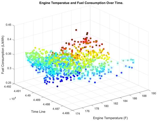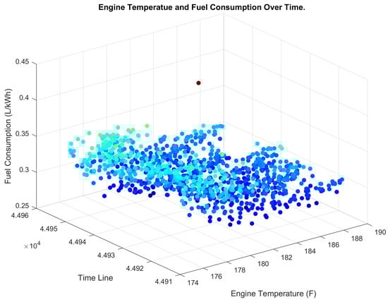 Figure 11 and Figure 12 show 3D scatter maps of engine temperature and fuel consumption over time before and after the implementation of the proposed system, respectively. The maps suggest a clear improvement in engine performance after implementing the proposed system, with more consistent and stable engine temperature and fuel consumption patterns.