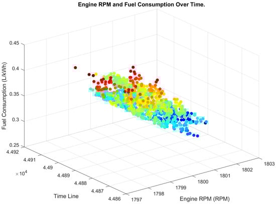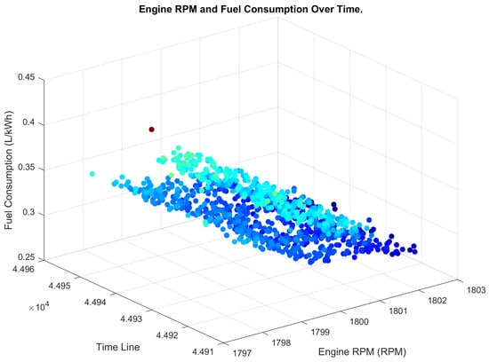 Similarly, Figure 13 and Figure 14 show 3D scatter maps of engine RPM and fuel consumption over time before and after the implementation of the proposed system, respectively. The maps suggest a clear improvement in engine performance after implementing the proposed system, with more consistent and stable engine RPM and fuel consumption patterns.