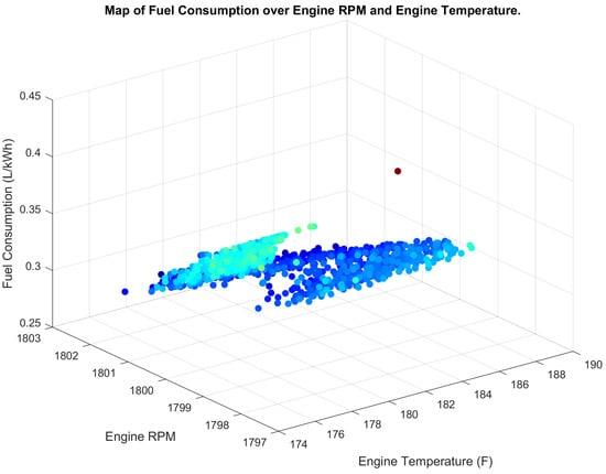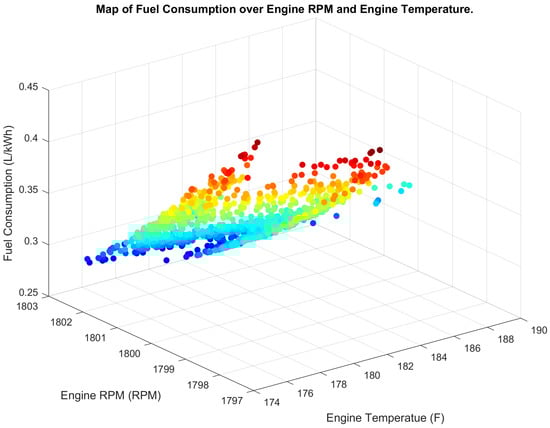 Finally, Figure 15 and Figure 16 show 3D scatter maps of the fuel consumption maps over engine RPM and temperature before and after implementing the proposed system, respectively. After implementing the proposed system, the maps suggest a more consistent and stable relationship between fuel consumption, engine RPM, and temperature.