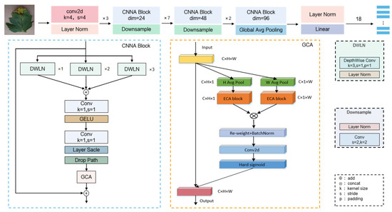 The overall recognition of disease spots and pests by the ConvNeXt-Nano network was difficult due to the small number of lightweight network ConvNeXt-Nano parameters and the large variety of target species with different disease and pest characteristics in this study. To resolve this, we proposed a lightweight multi-scale feature fusion module (MFFM) and a lightweight global channel attention (GCA) mechanism. The CNNA network model optimizing the ConvNeXt-Nano network with MFFM and GCA is shown in the Figure 3.