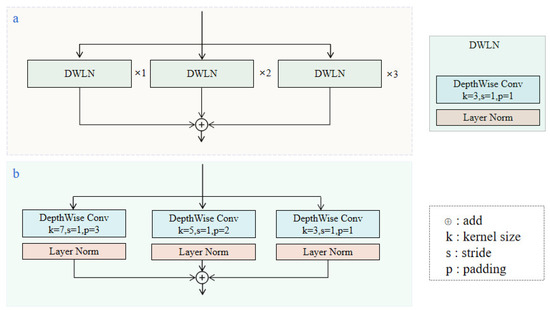 Multi-scale feature fusion module. ((a) represents the MFFM module stacked by multiple small convolution kernels, (b) represents the MFFM module stacked with a large convolution kernel).