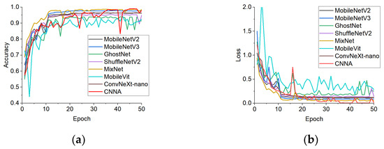 To further verify the performance and parameters of the CNNA network, the accuracy and loss curves of six lightweight networks, ConvNeXt-Nano, and the CNNA network were plotted in this study using the validation set of tomato pest data, as shown in Figure 6. The accuracy of each model on the validation set tended to be stable after 50 rounds of iterations. The accuracy curves showed that the CNNA network had the highest recognition accuracy but there was a sudden decrease and then an increase in accuracy. This change may have been caused by the large difference between the pest subject and the background environment of the different pests in the images, since the CNNA network learned less information about the same kinds of pest features. This led to the phenomenon that the model had errors in recognizing the same kind of pest, but this did not affect its overall recognition accuracy of tomato pests and diseases. The loss curve showed that the loss value of the CNNA network kept decreasing in the first 10 rounds and then started to converge in 10 rounds, but there was an increase in the middle. Additionally, the last 30 rounds tended to smooth out and almost converged to 0. In summary, the improved CNNA network achieved higher accuracy and lower loss than the other networks.