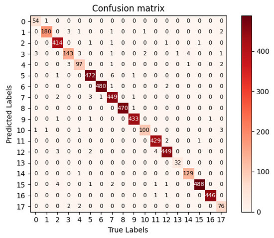 Confusion matrix (where label 0 corresponds to American leaf miner, 1 corresponds to aphid, 2 corresponds to bacterial spot, 3 corresponds to cotton bollworm, 4 corresponds to Diaphania indica, 5 corresponds to early blight, 6 corresponds to healthy leaves, 7 corresponds to late blight, 8 corresponds to leaf mold, 9 corresponds to septoria leaf spot, 10 corresponds to spider leaf mite, 11 corresponds to two-spotted spider mite, 12 corresponds to target spot, 13 corresponds to tea mite, 14 corresponds to tobacco budworm, 15 corresponds to tomato yellow leaf curl virus, 16 corresponds to tomato mosaic virus, and 17 corresponds to whitefly).