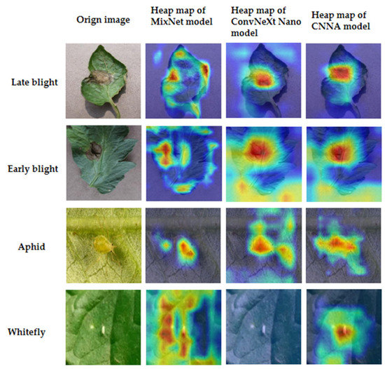 To better observe the learning ability of the CNNA model proposed in this experiment for tomato pest features, the classification results were visualized using Grad-CAM [40]. Specifically, feature visualization was performed on some data samples of the validation set, as shown in Figure 8. The MixNet, ConvNeXt-Nano, and CNNA network models were used for comparison, and the last layer was used for the network feature visualization layer. From the figure, it can be seen that the heatmap of MixNet focused on small disease patches and local areas of insect infestation, and the accuracy of the heatmap was not surprisingly high. The heatmap of ConvNeXt-Nano focused on patch areas but contained much irrelevant background information and could not identify whitefly. Compared with the MixNet and ConvNeXt-Nano models, the heatmap of CNNA could accurately identify key regions of late blight, with high accuracy and less attention paid to irrelevant and complex backgrounds. Meanwhile, the addition of MFFM with small-sized convolutional kernels resulted in more accurate whitefly identification in small regions.