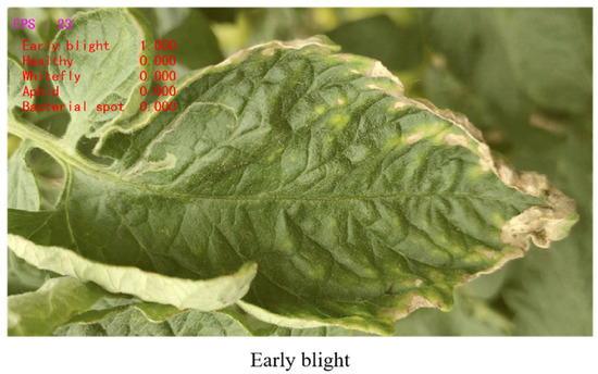 To further validate the performance of the CNNA model for identifying tomato pests and diseases and the inference time of the CNNA0 network mentioned in Section 2.2.2, the MixNet model with high accuracy, the MobileNetV3 model with high reputation, the CNNA0 model with multi-scale modules using large convolutional kernels, and the CNNA model proposed in this study were deployed to the Jetson TX2 NX and the server, respectively. Image inference was performed on the constructed tomato pest and disease validation set, and the inference time for a single image was calculated. Then, this study imported the captured video stream data into the Jetson TX2 NX, which performed classification based on the video data and displayed the maximum possible pest categories on the monitor (Figure 9). The comparison of single image inference time, numbers of model parameters and FLOPs, and accuracy are shown in Table 8, where the test results of a single image inference time are reported as the average of five experiments.