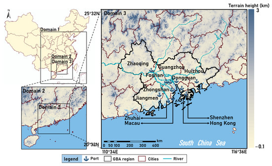 The GBA region is located in the south-central part of China, adjacent to the South China Sea. It includes a complex delta formed by the accumulation of sediment brought by the Pearl River system and its tributaries in the bay of the Pearl River Estuary, as well as Hong Kong and Macau [31]. Figure 1 displays a sketch map of the study area (20.32–25.32° N latitude and 110.34–116.36° E longitude), that includes the GBA region (marked with the thick black line) and its neighboring area. The analysis of the modelling results will be conducted targeting at the GBA region and the 11 cities within this region. As shown in Figure 1, the GBA region is surrounded by mountains to the west, north and east, and it has a coastline of thousands of kilometers. With rapid industrial development, the GBA region has become one of the three major urban agglomerations in China. It is also the largest comprehensive main hub of port clusters in South China, covering three of the world’s top ten ports, i.e., the Guangzhou Port, the Shenzhen Port and the Hong Kong Port [32].