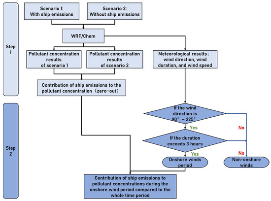 In this study, we conducted two steps to investigate the impact of ship emissions on air quality and quantify the effect of onshore winds in the GBA in 2018. The Schematic diagram of method is shown in Figure 2. In the first step, two emission scenarios were set to simulate the contribution of ship emissions to NO2, PM2.5, and O3 concentrations through the WRF/Chem model. In the second step, the onshore wind period was further extracted based on the results from the WRF model and the impact of onshore winds on pollutant transportation would be further analyzed. The scenario setting, model configuration, and input data are described in the details of the following subsections.