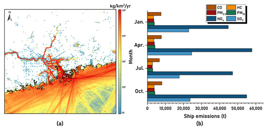 Overview of ship emissions in the GBA region in 2018. (a) Spatial distribution of annual NOx emissions from ships. (b) Ship emissions of different pollutants in typical months.