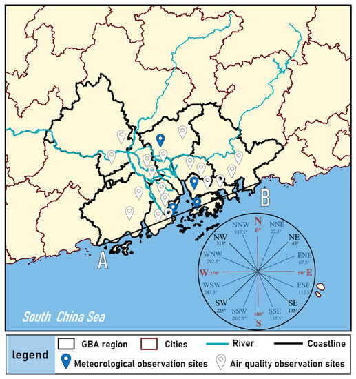 To study the influence of the onshore wind on ship pollution, it is first necessary to establish onshore wind criteria applicable to the GBA region. According to the method proposed by Sethuraman and Rayno [67], the wind direction is classified into three categories: onshore, offshore and alongshore. As the coastline in the GBA region (marked as AB in Figure 4) is oriented at approximately east-west at about 67.5–247.5°, the classification criteria in this study are defined as follows: (1) winds ranging from 90° to 225° through 180° (E-SW) were considered onshore winds, (2) those ranging from 45° to 292.5° were considered offshore winds (NE-WNW), and (3) the rest were alongshore winds.