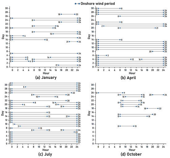Given the above criteria, we extracted the meteorological simulation results of the onshore wind period from the WRF model for different months in 2018. The total number of onshore wind occurrences was 1304 h, accounting for 44.2% of the total simulated time period (2952 h) over the duration of four months. Table 4 summarizes the occurrence times and frequencies of the onshore wind as well as the average wind speed for each month in the GBA, and Figure 5 depicts the specific occurrence time for each day. It can be seen that in the GBA, the occurrence frequency of onshore winds is higher in April and July and lower in January and October. This is because the GBA region is located at low latitudes, which is close to the tropics and has a subtropical climate. Affected by the East Asian monsoon in July, the onshore winds occur constantly with a majority from the South China Sea and the Western Pacific. In January and October, in contrast, the winter monsoon blows mostly from inland as an onshore wind. Moreover, the diurnal lasting time of the onshore winds in April and July is also longer. In these months, with an earlier sunrise, stronger solar radiation, and more rapid land warming, the temperature difference between land and sea formed earlier and could be more pronounced, promoting the formation and duration of onshore winds. However, in January and October, the solar radiation becomes weaker and the temperature difference between land and sea is smaller than that in April and July, resulting in less frequent onshore winds.