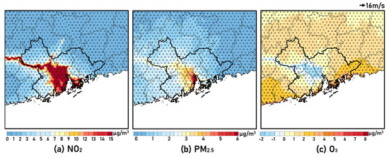 Onshore winds play an important role in the diffusion and transportation of pollutants in coastal areas [25,81,82]. In regions with high ship emission intensity, the onshore winds can induce pollutants emitted from ships transported to inland areas [10,26], leading to more severe air pollution. However, the levels and characteristics of the impact of onshore winds have been qualitatively investigated in previous studies less regarding the ship-induced air pollution in the GBA [72,83]. To conduct a more in-depth investigation into this matter, this study explores the impact of onshore winds on the contribution of ship emissions to air pollutant concentrations including both PM2.5 and O3, by examining the wind direction on an hourly scale for four representative months in 2018 and screening the simulation results for periods with more than 1300 h of onshore winds. Results will be analyzed through both a temporal and spatial perspective.