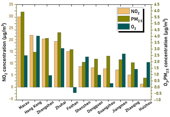 Contribution of ship emissions to pollutants in different cities in the GBA, the legend on the left shows NO2 and the legend on the right shows PM2.5 and O3. Columns are arranged from the highest to lowest NO2 concentrations.