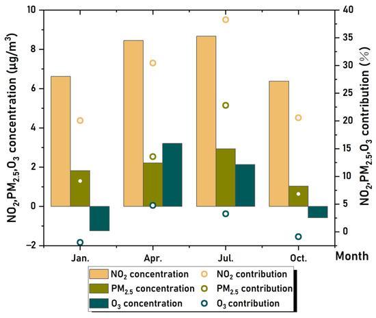 Compared to NO2 and PM2.5, the impact of ship emissions on O3 pollution in different months is more complicated. Although the annual contribution of ship emissions to the O3 concentration in the targeted 11 cities is only 0.9 μg/m3, it shows notable monthly variations. Statistics indicate that ship emissions led to an overall increase in O3 concentrations in April (3.2 μg/m3, 4.8%) and July (2.1 μg/m3, 3.2%), respectively, but a decrease in January (−1.3 μg/m3, −2.0%) and October (−0.6 μg/m3, −0.9%), respectively (Figure 8). On this basis, the bifold impact of ship emissions on O3 concentration appears in all months and shows notable spatial variation in different months. As shown in Figure 9c, the negative contribution of ship emissions to O3 concentrations was observed in all four months of which the extent was wider in January and October, encompassing nearly all cities except for Huizhou. In the study on the monthly average contribution of ship emissions to O3 concentrations, Chen et al. [14] found that the contribution of ship emissions to O3 concentrations in the PRD region in July 2015 was 1.9 μg/m3, which in this study was 2.1 μg/m3, slightly higher than the study by Chen et al. [14]. This is due to the fact that NOx emissions from ships were greater in 2018 than in 2015, and in July most of the cities in the region are in the NOx control area, meaning the larger amount of NOx emissions from ships leads to a higher O3 concentration contribution.