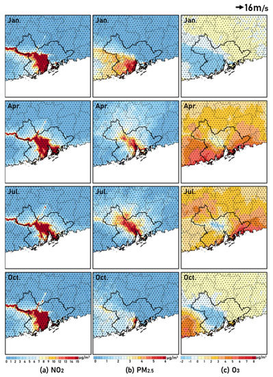 The seasonal variation in the GBA is unremarkable, although, changes in the prevailing wind direction still largely affect the transportation pattern of ship emissions in different months. The contribution of ship emissions to the concentration of all three pollutants tended to be high in April and July and low in January and October. The contribution of ship emissions to NO2 and PM2.5 concentrations in the GBA peaked in July, at 8.7 μg/m3 and 2.9 μg/m3, respectively, while ship emissions led to an increase in O3 concentrations in April (3.2 μg/m3) and July (2.1 μg/m3), but a decrease in January (−1.3 μg/m3) and October (−0.6 μg/m3). These monthly variations in ship contributions are highly relative to the emission changes, wind direction and atmospheric oxidation mechanism.