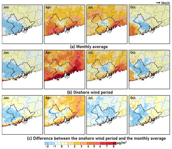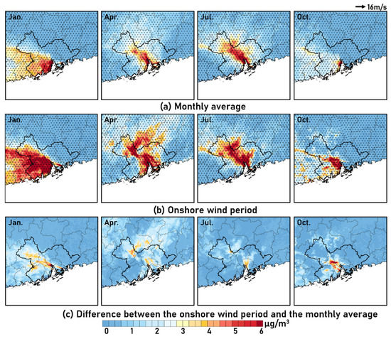 Figure 10 shows the contribution of ship emissions to PM2.5 concentrations for monthly averages during the onshore wind hours and the differences between them. The contribution of ship emissions to the annual PM2.5 concentrations during onshore wind periods in the GBA region was 0.9 μg/m3 (1.5 times) higher than the annual average. This amplified effect of ship-induced PM2.5 pollution by onshore winds has also been reported in the YRD region, with similar ratios of 1.8–2.7 times over four months [10]. However, Lv et al.’s study [10] used the average daily wind direction as the condition for determining the onshore wind days, while this study determined the onshore winds on an hourly scale. This finer temporal resolution may result in a more accurate quantitative evaluation of the impact of onshore winds on pollutant transportation.