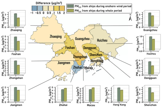 Figure 11 further summarizes the differences in the contribution of ship emissions to PM2.5 concentrations in 11 cities in the GBA region during the onshore wind period compared to the whole time period. It can be seen that during the onshore wind period, the contribution of ship emissions to PM2.5 concentration is much higher than the annual average in all cities except Macau and Zhuhai. The cities with the largest increase during the onshore wind period are Zhongshan and Foshan, with an increase of 1.9 and 1.5 μg/m3, respectively. The city with the smallest difference is Huizhou, which increases by only 0.2 μg/m3. This is because in the GBA, the annual average wind direction of the onshore wind is southeastward, and Zhongshan and Foshan are located in the west of the GBA area, in the downwind zone, so these two cities are more affected by ship emissions. Huizhou, on the other hand, is located in the southeastern part of the GBA region and is in the upwind direction, so it is less affected. In contrast, Macau and Zhuhai show a higher annual average contribution than the contribution during the onshore wind, where the contribution of ship emissions to PM2.5 concentration is 0.8 μg/m3 and 0.4 μg/m3 lower than the annual average. This can be attributed to the fact that these two cities are located on the two sides of the Pearl River Estuary respectively, which are influenced by ship emissions in both offshore and onshore winds (even when the offshore winds are blowing, the emissions from ships in the Pearl River Estuary are transported to these two cities).